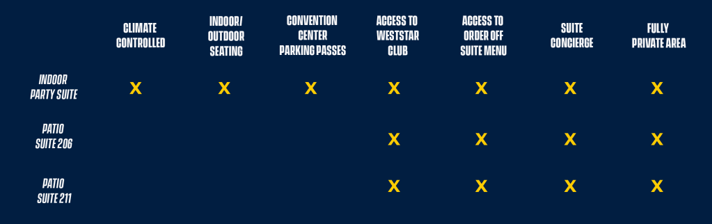 - Exclusive premium food and beverage menu options available for purchase and served in the privacy of your Patio Suite