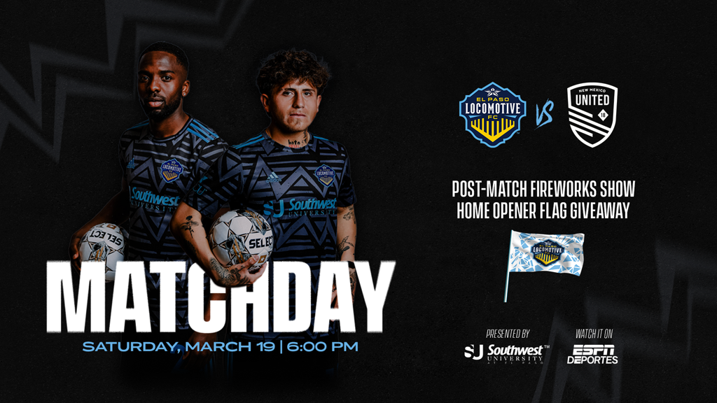 El Paso Locomotive FC (0-1-0, 0 points, West-10) renews its fiercest rivalry this Saturday, March 19, when it hosts New Mexico United (1-0-0, 3 points, West-3) at Southwest University Park for it Home Opener. Kickoff is set for 6:00 p.m. MT and will be broadcast nationally on ESPN Deportes and locally on KFOX14. Tickets are also available online at eplocomotivefc.com/tickets or by calling 915-235-GOAL.